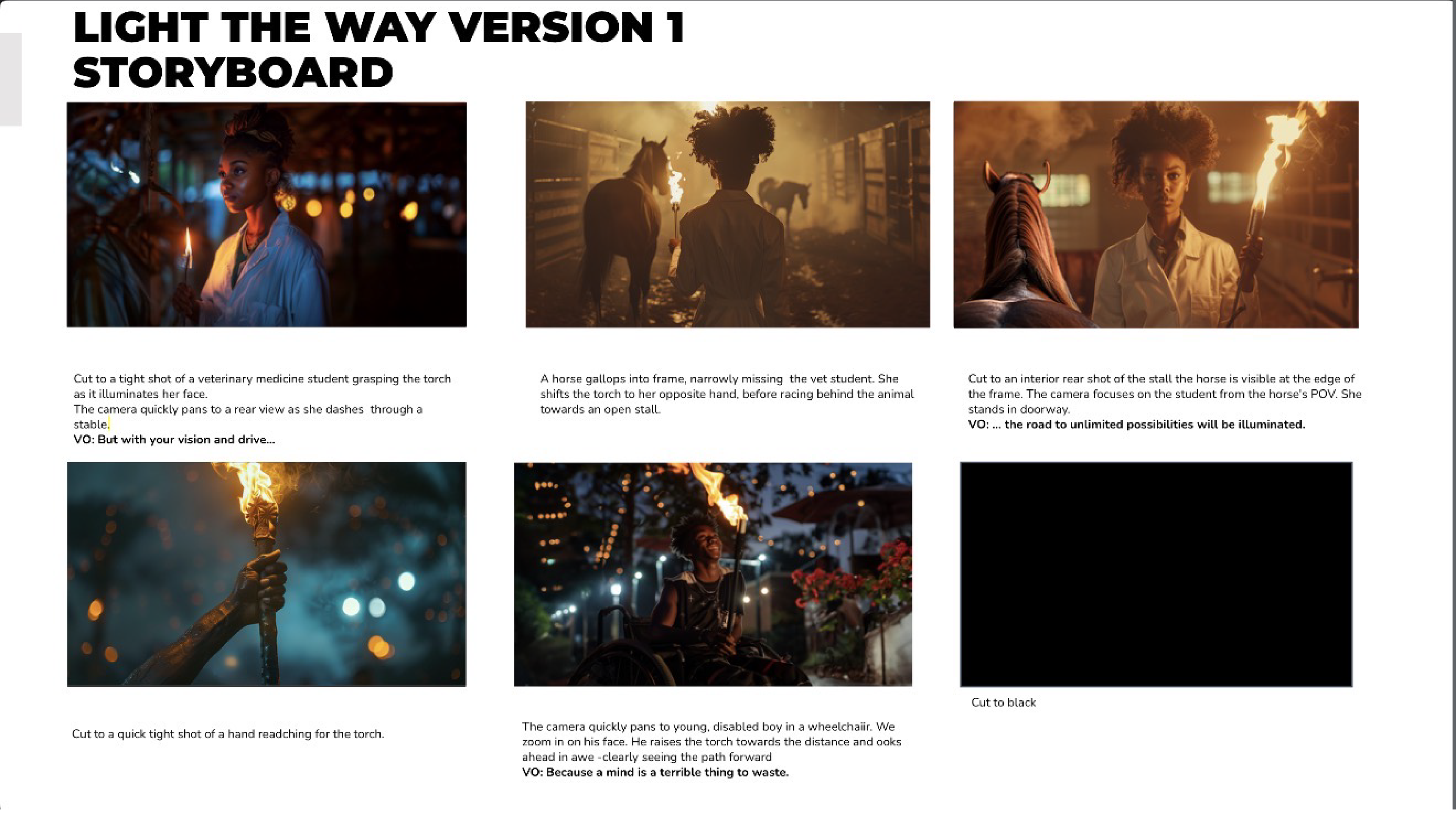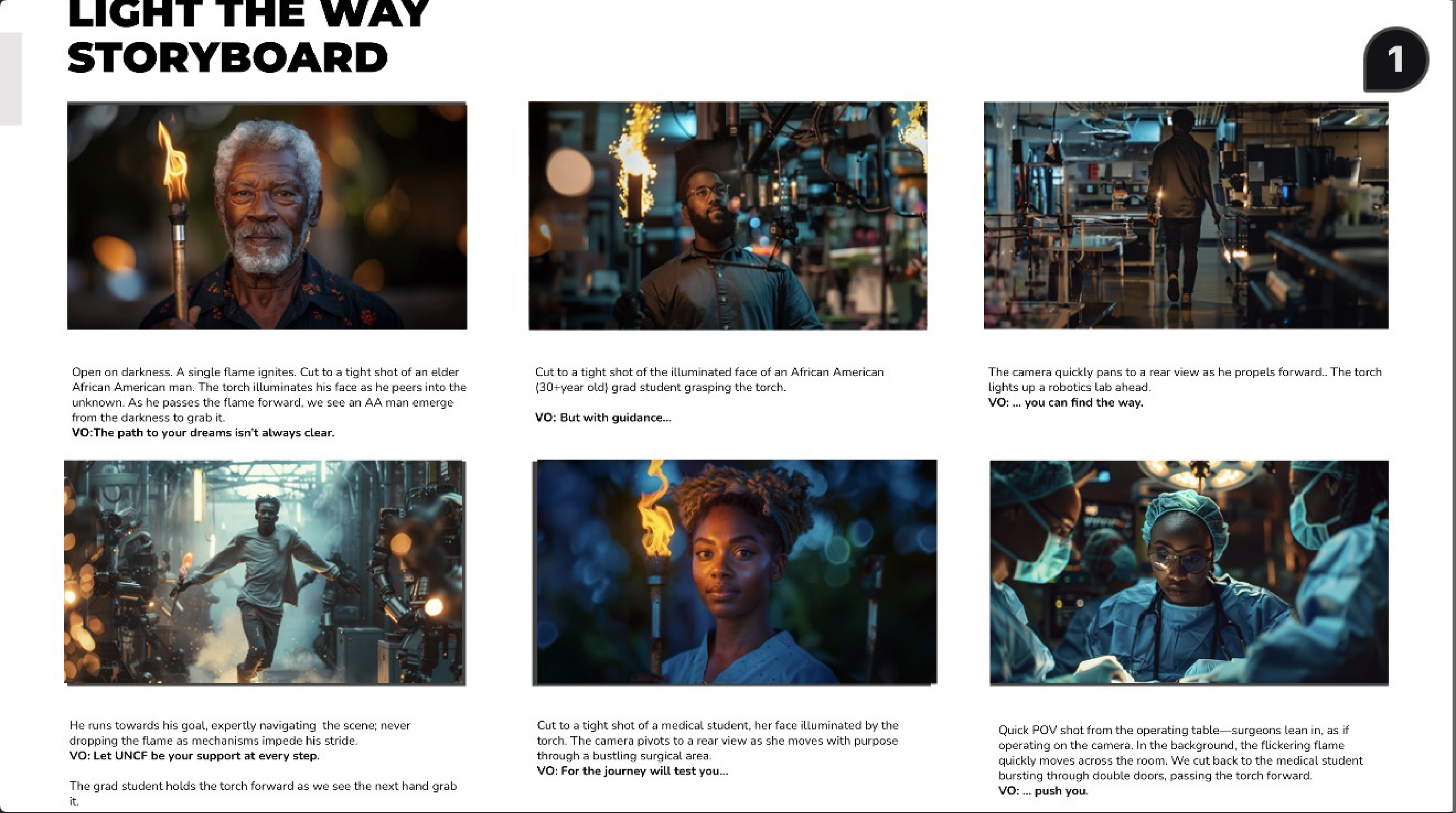 The strategy was clear: we needed to show that UNCF isn’t just a historical institution; it’s actively shaping the future. We focused on the visual metaphor of passing the torch, symbolizing the knowledge, support, and opportunity UNCF provides to each generation. This torch would be carried by different students, navigating through different fields of study, to highlight the variety of disciplines UNCF supports—from robotics to medicine.
